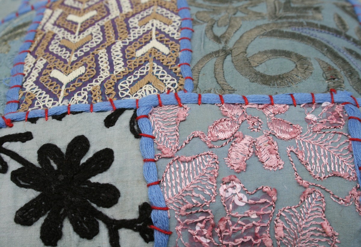 This cushion is made of cotton in ice blue, patchwork and sophisticated decoration. The cushion has a size