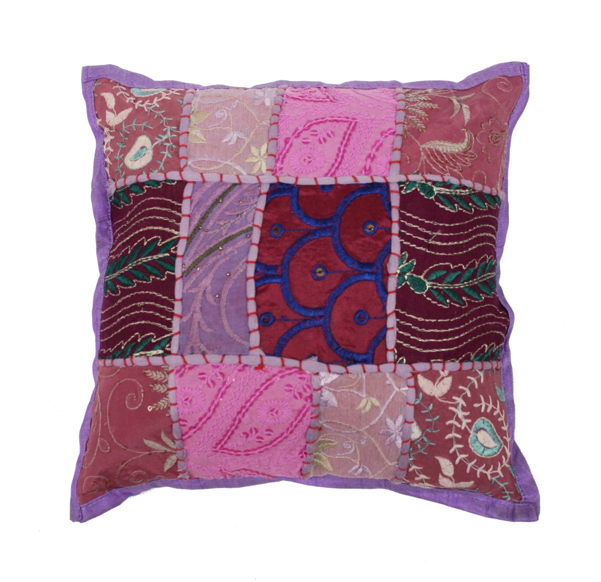 This cushion is made of cotton in purple, patchwork and refined decoration. The cushion has a size