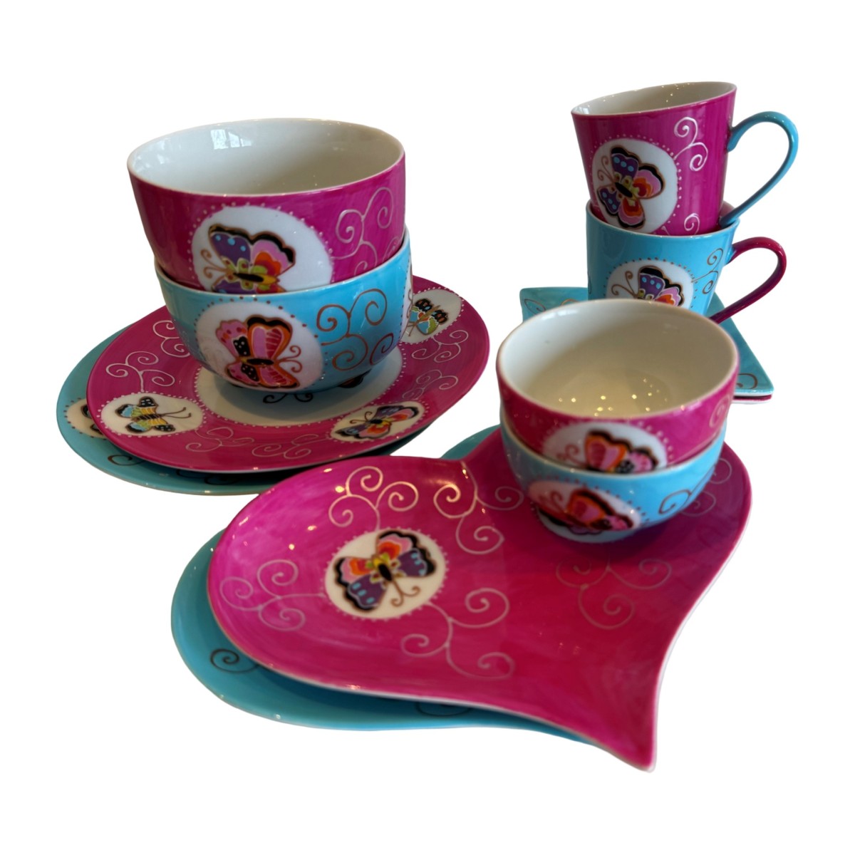 This colourful sophisticated porcelain tableware, has a sea blue glaze and is richly decorated with butterflies. The gift box containing the tableware includes a plate, bowl, smaller bowl and mug. The ornate hand-painted butterfly illustration and patterns make it a cheerful set; Beautiful for decoration or for use at a festive occasion; such as a children's party, birthday party with cake! With this tableware on the table, your child will feel like a prince or princess just like in a fairy tale! Also available in the colour fuchsia. Great as a gift!
