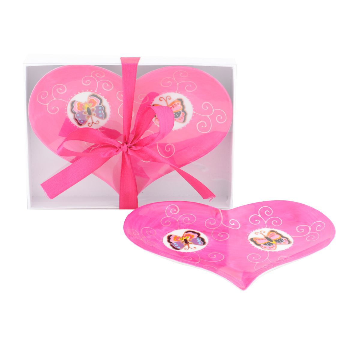 Dit kleurrijke verfijnde porseleinen bordje in hart vorm heeft een glazuur in fuchsia roze en is rijkelijk versierd met vlinders. De sierlijke handbeschilderde illustratie van de vlinder en patronen maken het tot een vrolijk geheel; Mooi ter decoratie of voor gebruik bij een feestelijke gelegenheid; zoals een kinderparty, verjaardagsfeestje met taart! Met dit serviesje op tafel voelt je kind zich de prins of prinses aan tafel net als in een sprookje! Ook in de kleur zeeblauw leverbaar.
