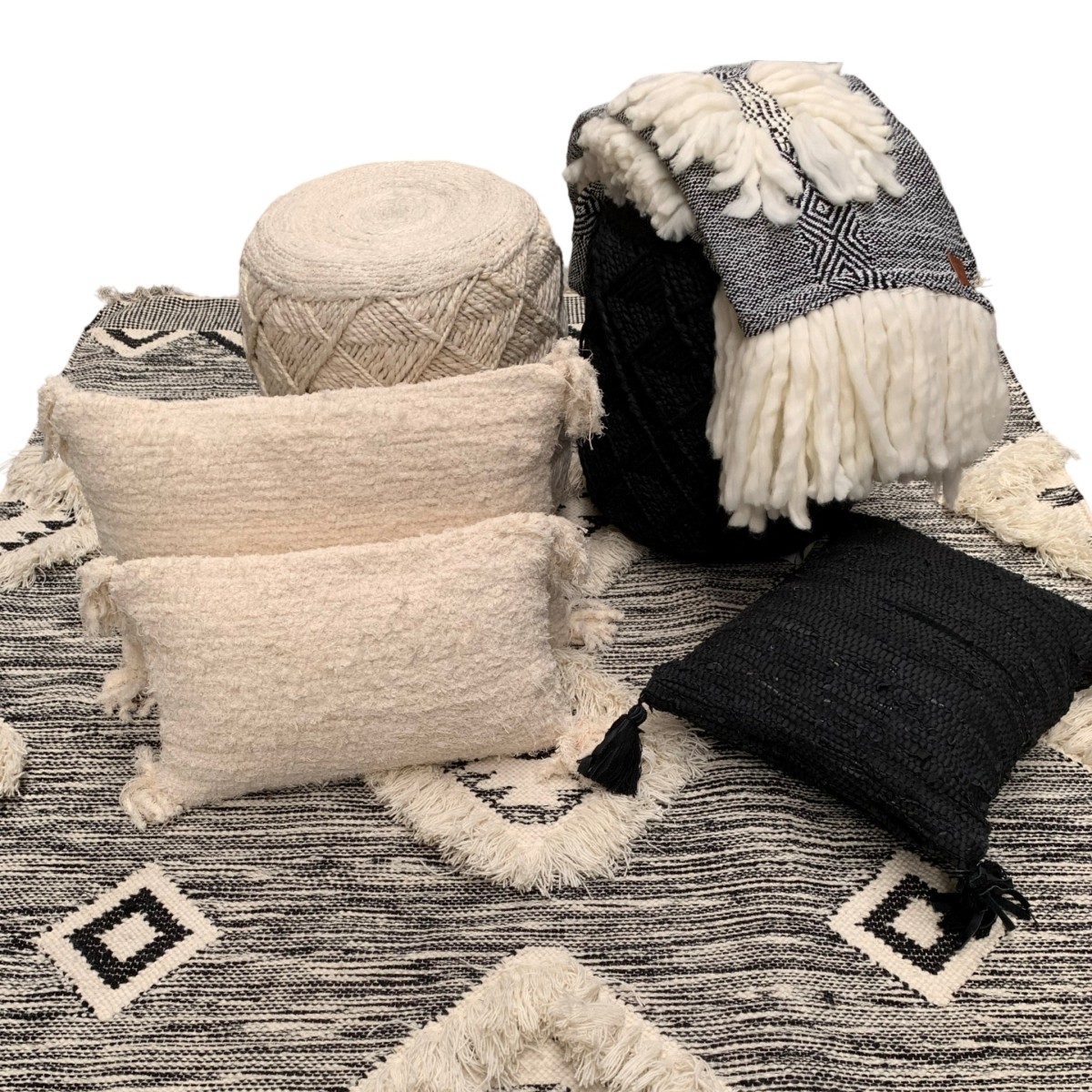 Deken geweven zwart ivoorwit met franjes BOHO 130x170cm
